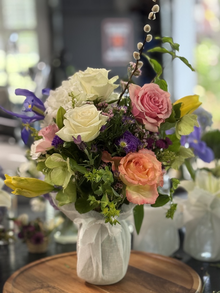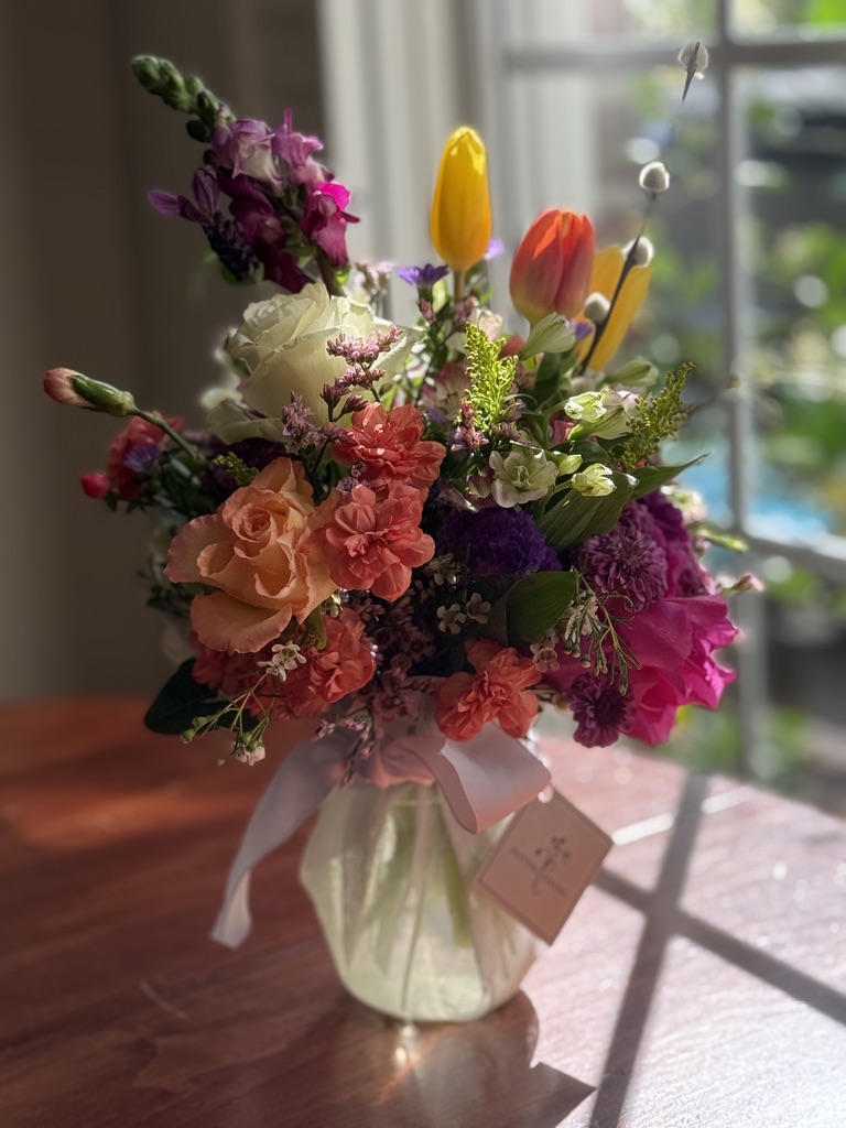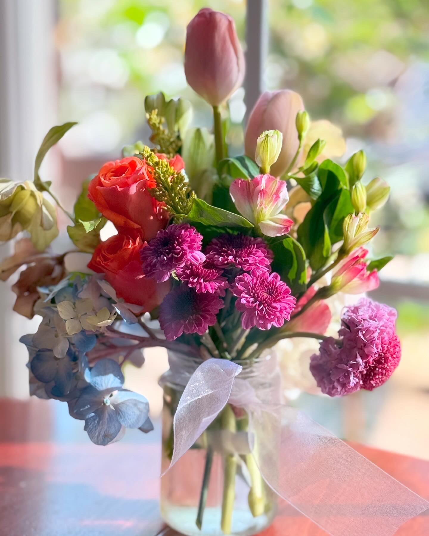 Gorgeous assortment of the season’s freshest blooms, arranged in a mason jar, & wrapped with a ribbon