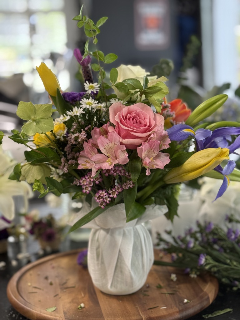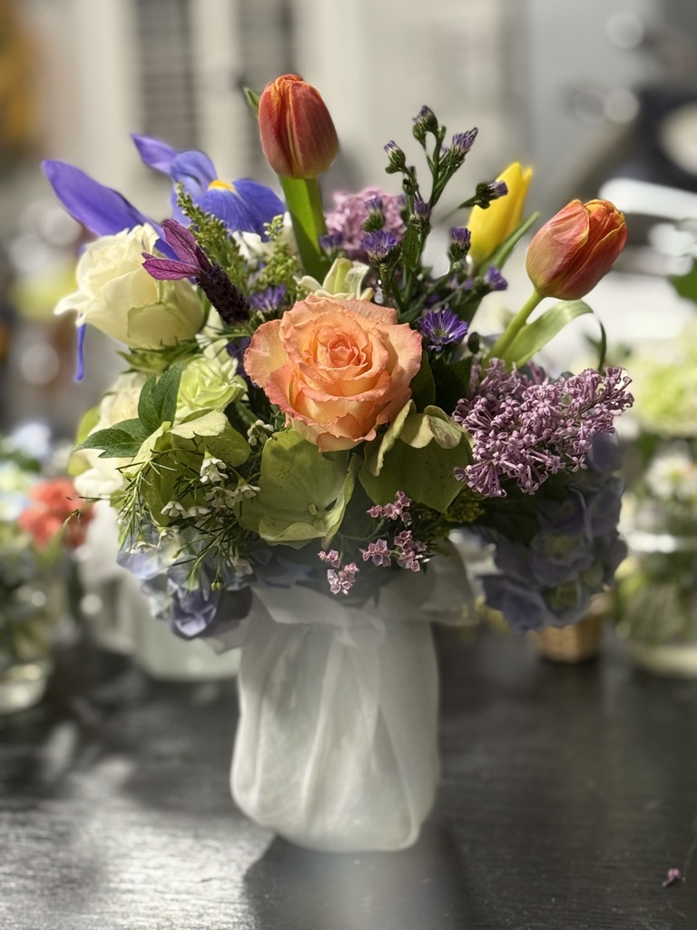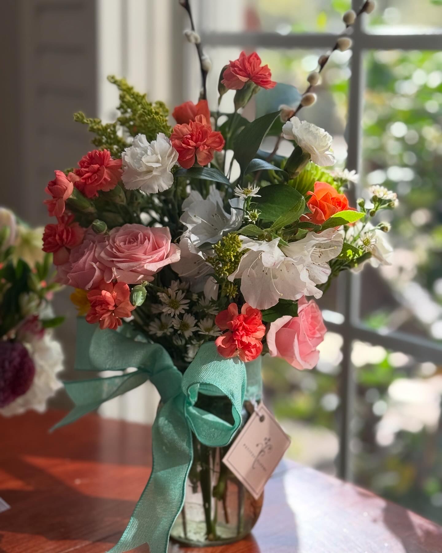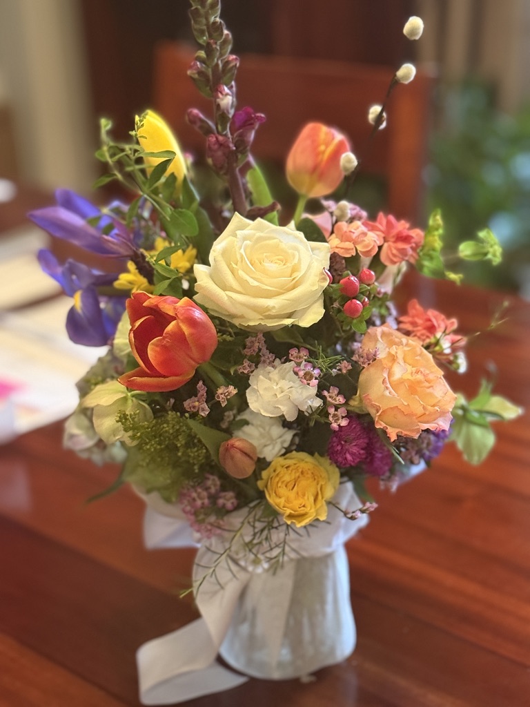 Gorgeous assortment of the season’s freshest blooms, arranged in a mason jar, & wrapped with a ribbon